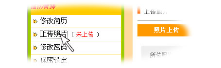 | 注冊成功后系統(tǒng)會(huì)自動(dòng)跳轉(zhuǎn)到個(gè)人管理頁面,點(diǎn)擊“上傳照片”,上傳不大于100KB的照片,這樣更容易讓招聘企業(yè)青睞; |